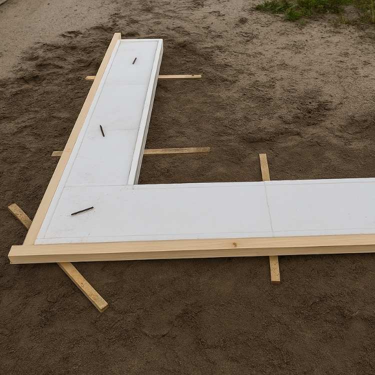 De bodems van de CarpentierMooren EPS‑funderingskisten worden geleverd in de juiste breedte van jouw fundering, wat het werk een stuk eenvoudiger maakt. Plaats de bodems precies op de plek waar de fundering moet komen, zodat alles netjes op maat ligt. Veel mensen gebruiken haringen, vergelijkbaar met tentharingen, om de bodems vast te zetten, maar een betere en goedkopere methode is om ze met twee schroeven van 5 × 120 mm door de bruggetjes heen te bevestigen. Zo blijven de bodems stevig op hun plek en ben je verzekerd van een nauwkeurige, maatvaste montage.