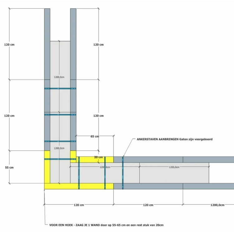 • Bij begin en eind van de fundering: extra bruggetjes op 20 cm.