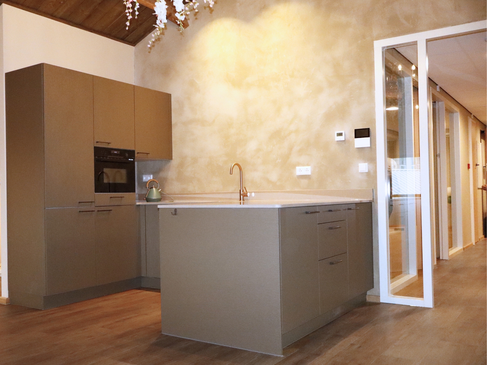Daar bovenop ligt het Kemie composiet werkblad in Coral Clay Glans. Dat glansje geeft de keuken net wat extra luxe en zorgt dat het licht mooi door de ruimte speelt. Tegelijk is het een heel praktische keuze: composiet is sterk, onderhoudsvriendelijk en ideaal voor dagelijks gebruik. De warme, lichte toon sluit bovendien prettig aan bij de vloer en wandafwerking, waardoor alles rustig in elkaar overloopt.